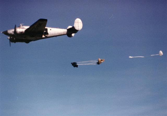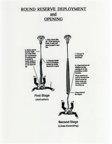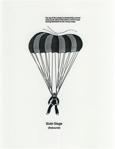 2 3 4 In the cockpit Egress How does it work? Once you have removed the ripcord handle from its pocket, pull it sharply in the direction opposite the housing. While the last ripcord pin only has to move about 1" for activation, it's a good idea to pull the ripcord handle to arms length. Once the pins clear their locking loops or cones, the container will open and the spring loaded pilot chute will jump out into the airstream, pulling the parachute along with it (1a). If a full-stow diaper deployment device is used (our favourite system) the lines will unstow from the diaper (1b), and when finished unstowing, the diaper will unlock and the canopy will be allowed to inflate (2). Note the canopy inflates from the top down, not the bottom up. After the initial opening shock (3) the canopy will rebound to some degree (4) and then settle down into a constant rate of descent and forward speed. After it's open Parachutes produced in the USA must comform to either a military standard, or the FAA TSO C23. They are tested at various speeds and weight combinations, hot/cold testing, long term compaction, and user interfacing, all to assure it will open quickly and properly when needed. As soon as possible after the canopy is open you need to decide where you can land. Looking down past your toes should give you some idea of your drift, and you can steer in the direction that will take you the closest to where you would like to land. You will not always find a nice flat soft meadow for landing, so you must decide as early as possible where you are likely to drift to, and take evasive action to miss any obstacles that could cause injury. Good things to miss are: buildings, trees, power lines and water. Try to line yourself up so that you are facing into the wind without turning when making ground contact. Feet and knees tight together, knees slightly bent, and hands up holding onto the rear riser. Roll out the landing, keeping your elbows in..... the canopy will continue to offer some support after your feet have touched the ground, and through the roll. Be prepared to get out of the harness as quickly as possible. If it's windy, and you can't get out of the harness quickly, deflate the canopy as quickly as possible to prevent being dragged. To do this you can either get up and run around the downwind side of the canopy (the wind will deflate the canopy as it pushes it towards you), or if you can't get up, grab one or two lines of the canopy that are at the bottom, touching the ground. Haul in these lines, hand over hand, until the canopy eventually collapses. At this point you will either have people rushing over to assist you, in which case you will most likely head for the nearest bar, or if away from civilization you will be deciding about where to make a campground. A parachute stretched out makes a great marker for the Search & Rescue people, and it will make a a good tent as well. The lines can be cut and used for many things, from tying on a splint to fabricating a shelter or lashing a raft together. The above is a general guideline, but does not override your owners manual for exact procedures on care of your parachute, donning, egress and steering/landing under your parachute. Please contact us if you have questions on any of the above. Steering is accomplished by either toggles on the rear risers (the webbing from the harness to the line attach points above you) or pulling on the rear risers themselves -- the manufacturers instructions will explain this. Forward speed will vary according to the design of the canopy and suspended weight, the groundspeed varies with wind speed and direction. Steering capability will vary on the canopy design. If there is not much wind you should be able to land in an area directly underneath you or a bit off to the side.